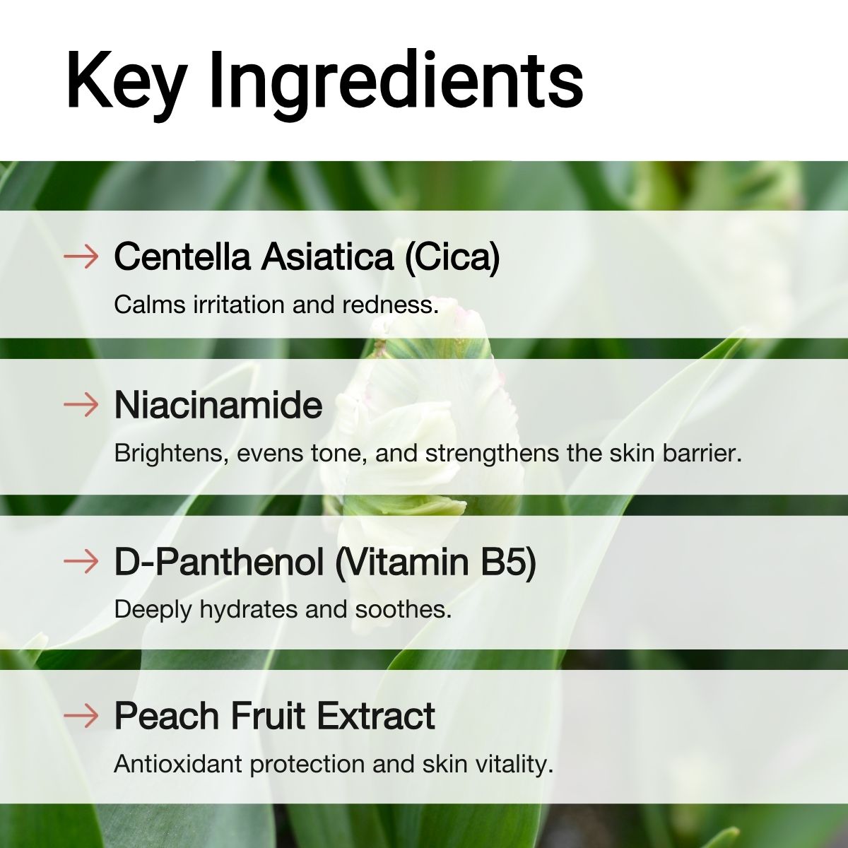 Aqua, Glycerin, Propylene Glycol, Butylene Glycol, C12-15 Alkyl Benzoate, Octocrylene, Octisalate, Bis-Ethylhexyloxyphenol Methoxyphenyl Triazine, Diethylamino Hydroxybenzoyl Hexyl Benzoate, Silica, Dimethicone, Dimethiconol, Cetearyl Alcohol, Ceteareth-20, Carbomer, Acrylates/C10-30 Alkyl Acrylate Crosspolymer, Prunus Persica (Peach) Fruit Extract, Centella Asiatica Leaf Extract, D-Panthenol, Niacinamide, Titanium Dioxide, Aluminium Stearate, Alumina, Ethylhexylglycerin, Phenoxyethanol, Triethanolamine