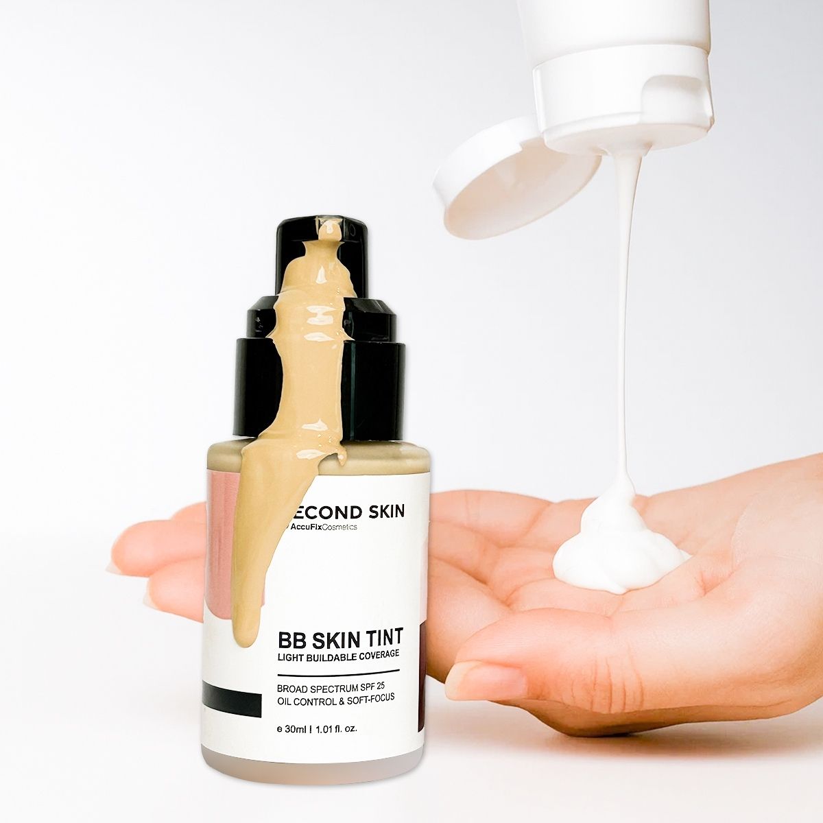 Perfect & Cover: Dispense 1-2 pumps of the Second Skin BB Skin Tint onto your fingertips. Blend evenly across your face for a sheer, radiant finish. Add another layer where you need more coverage.
