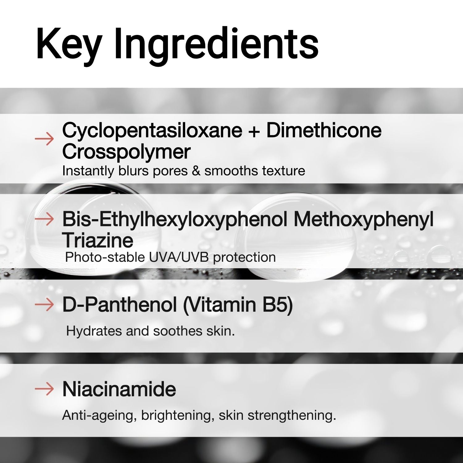 Ethylhexyl Methoxycinnamate, Bis-Ethylhexyloxyphenol Methoxyphenyl Triazine, Diethylamino Hydroxybenzoyl Hexyl Benzoate, Cyclopentasiloxane, C12-15 Alkyl Benzoate, Cetyl Dimethicone, Dimethicone Crosspolymer