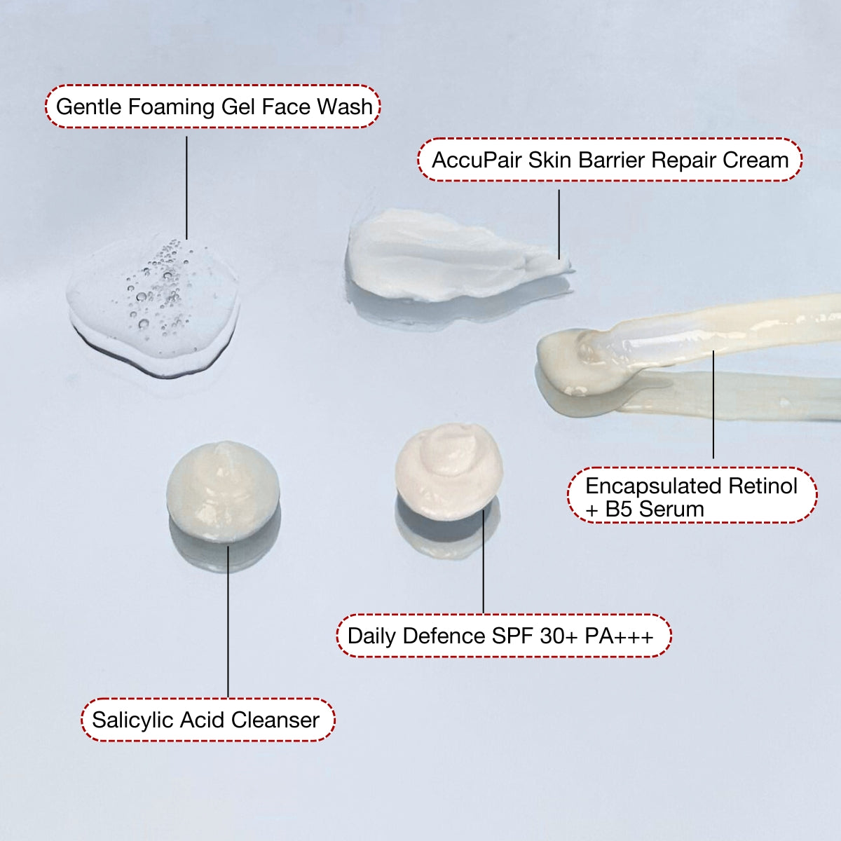 ✔️ Bundle Includes: 1x Gentle Foaming Gel Face Wash, 1x Salicylic Acid Cleanser, 1x Encapsulated Retinol + B5 Serum, 1x AccuPair Skin Barrier Repair Cream (LITE), 1x Daily Defence SPF 30+ PA+++