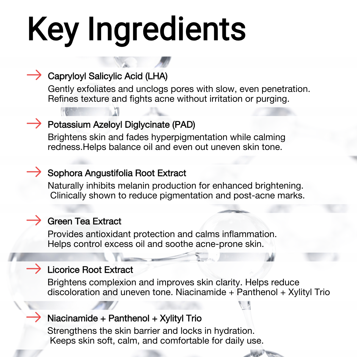 ✔️ Key Ingredients: Capryloyl Salicylic Acid (LHA), Potassium Azeloyl Diglycinate (PAD), Niacinamide, Panthenol