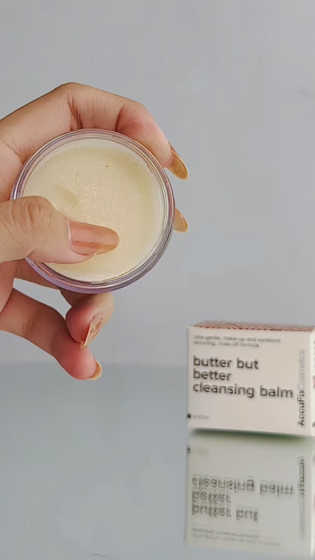 Our Butter But Better Cleansing Balm is a luxurious makeup remover and nourishing cleanser in one. It gently dissolves even the most stubborn makeup, sunscreen, and daily buildup, leaving your skin thoroughly clean and hydrated. On contact, this cleansing balm melts into a silky oil that glides effortlessly across the skin. When water is added, it emulsifies into a lightweight milky texture that rinses off easily—no need for cotton pads.