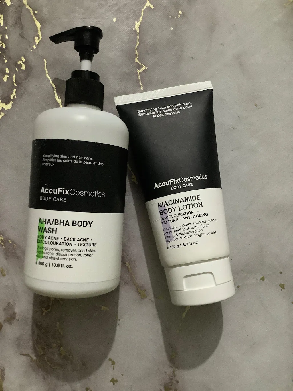 Includes AHA/BHA Body Wash and Niacinamide Body Lotion. Use both together daily for best results — and avoid soap entirely.