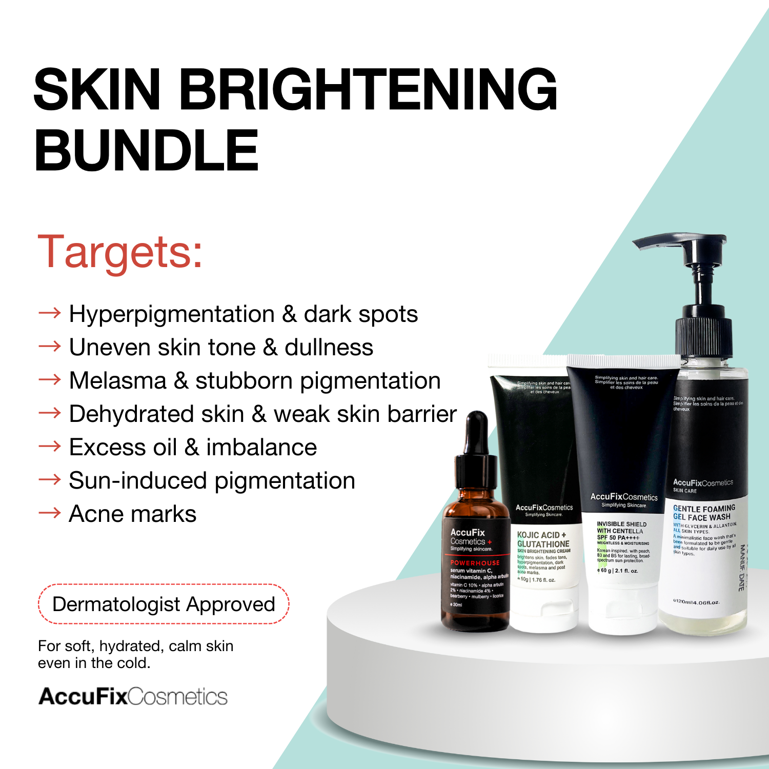 Yes, the Skin Brightening Bundle is suitable for sensitive skin, as it includes gentle formulations like the Gentle Foaming Gel Face Wash and Invisible Shield With Centella SPF 50 PA++++, which help to soothe and protect the skin. The Powerhouse Serum uses a stable form of vitamin C (sodium ascorbyl phosphate) that is less likely to cause irritation. However, it’s always recommended to perform a patch test before using new products to ensure compatibility with your skin.